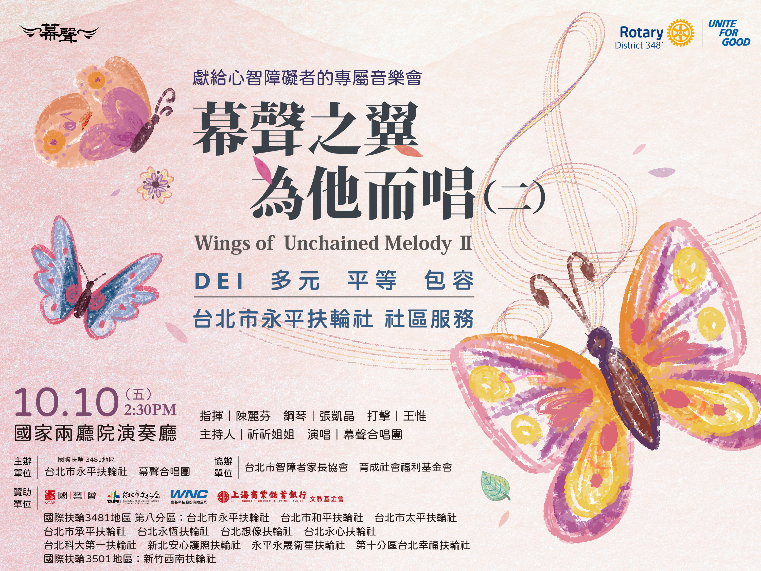 時間:2025年10月10日(五)14:30 地點:國家演奏廳 所有席次分為公益贈票、一般票與貴賓公關票三種。 售票資訊:OPENTIX 售票系統 公益贈票:限政府立案之心智障礙社會福利團體或學校團體申請,請洽幕聲合唱團。 一般票:600元。 *身心障礙人士及陪同者(限1人)享 5 折優惠。