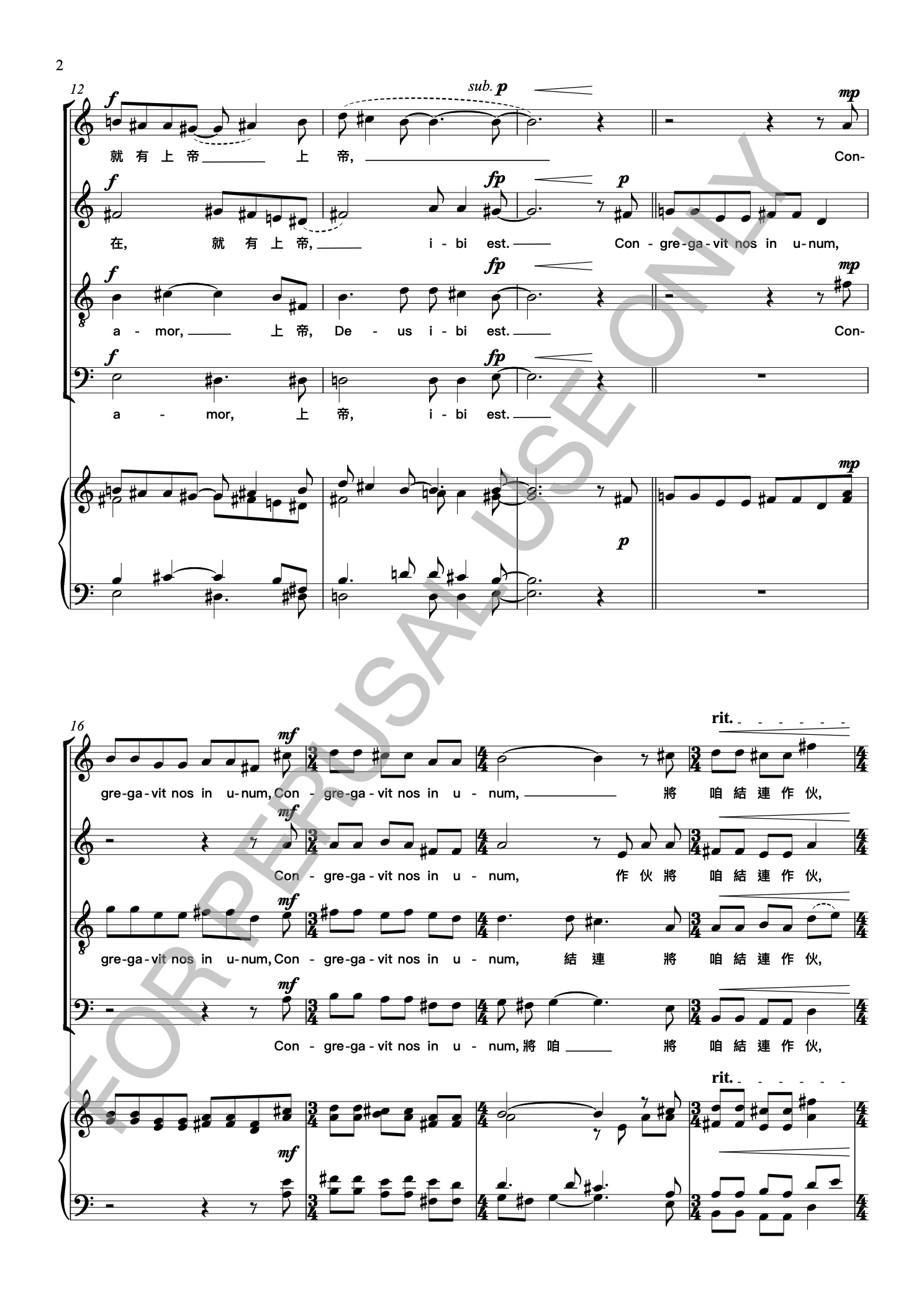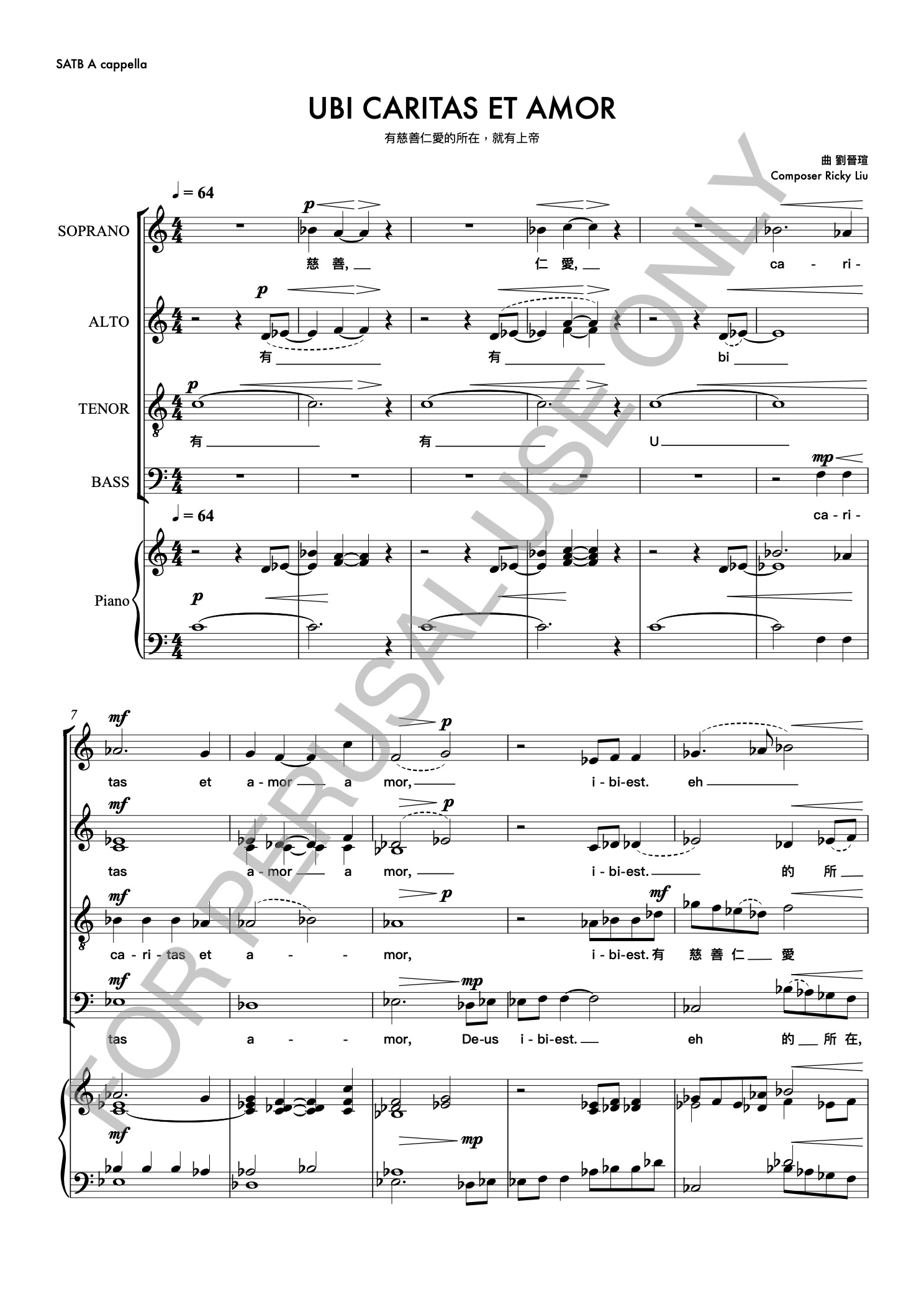 此曲以拉丁文與閩南語兩種語言交織演唱,兩種看似迥異的語言,在聲音的流轉中彼此映照,亦期盼聽眾能透過閩南語,更親近且自然地體會其中的精神意涵。全曲以無伴奏混聲四部合唱(SATB A cappella)形式譜寫,由拉丁文柔和的旋律線條開啟,緩緩引領至音韻相近的閩南語段落。隨著旋律的推進,兩種語言時而交替、時而重疊,音樂逐步以豐富的和聲色彩堆疊出華麗而飽滿的張力。隨後,旋律回歸至與開頭呼應的柔和段落,形成如潮起潮落般的音樂波瀾。最終以層次細膩、餘韻悠長的 “Amen” 作結,為全曲劃下莊嚴、堅定而溫柔的句點,歌聲在教堂或音樂廳中靜靜迴盪。